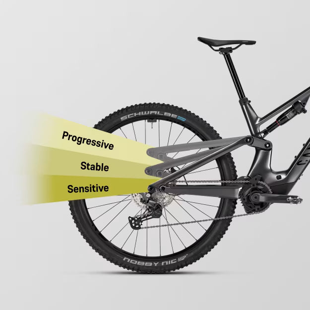 140 mm Federweg – aufgeteilt in drei Phasen. Im ersten Drittel saugt der Hinterbau selbst kleinste Schlänge feinfühlig auf und erzeugt enorme Traktion. Im mittleren Federweg gibt dir das Fahrwerk eine definierte Rückmeldung vom Untergrund und bügelt satt über den Trail. Und damit du auch bei heftigen Einschlägen entspannt bleiben kannst, verhält sich die Federung zum Ende hin progressiv, sodass du immer Reserven hast.