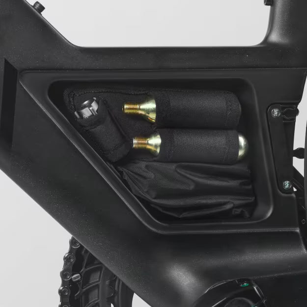Die smarte, vollintegrierte Storage-Lösung im Tretlagerbereich trägt durch ihre doppelwandige Konstruktion zusätzlich zur Erhöhung der Tretlagersteifigkeit bei. Das Toolkit kommt inklusive einem Ersatzschlauch, zwei Reifenhebern sowie einer CO2-Pumpe und bietet Platz für bis zu 2 CO2-Kartuschen. Der Schiebedeckel sorgt für einen aufgeräumten Look und freien Zugriff auf das gesamte Fach.